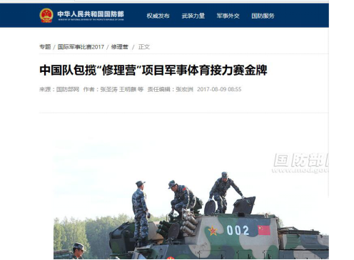 中華人民共和國國防部官方網(wǎng)站《國際軍事比賽》曾專題刊載《中國隊(duì)包攬“修理營”項(xiàng)目軍事體育接力賽金牌》的報(bào)道。報(bào)道詳細(xì)介紹了2017年八月份在俄羅斯鄂木斯克舉行的2017國際軍事比賽的精彩賽況:我陸軍某部參賽隊(duì)員楊海軍、嘎瑪先后在“500米國際障礙賽”、“波比運(yùn)動(dòng)”獲得兩個(gè)單項(xiàng)第一并榮獲金牌;轉(zhuǎn)入技術(shù)賽區(qū)后,9名中方隊(duì)員和領(lǐng)隊(duì)齊心協(xié)力、密切配合精確完成坦克施救后送和脫鉤等4個(gè)專工作業(yè)項(xiàng)目;最終中國隊(duì)以用時(shí)42分43秒的優(yōu)異成績,領(lǐng)先第二名俄羅斯部隊(duì)參賽隊(duì)近3分鐘,以絕對(duì)優(yōu)勢(shì)奪得軍事體育接力賽團(tuán)體第一并榮獲金牌。我軍之所以能一舉囊括這標(biāo)志實(shí)戰(zhàn)能力的體能項(xiàng)目三塊金牌,和參賽士兵在賽前采用了合肥恒誠智能技術(shù)有限公司提供的“智能化低氧體能作訓(xùn)系統(tǒng)”和科學(xué)的軍事體能訓(xùn)練方法關(guān)系密切。榮獲兩個(gè)單項(xiàng)金牌的中方隊(duì)員楊海軍、嘎瑪還在“國際軍事比賽-2017”的32個(gè)參賽國只有5個(gè)“最佳運(yùn)動(dòng)員”名額的情況下,均被俄羅斯國防部評(píng)為“最佳運(yùn)動(dòng)員”。